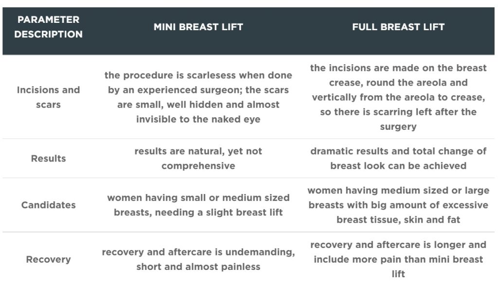 Mini mastopexy is a modification of the traditional breast lift. It aims to achieve similar results with less scarring and a less extensive procedure. The main differences between mini and full breast lift are: