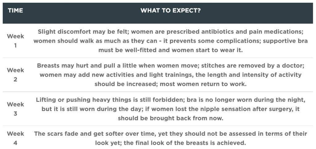 How long is the recovery time after breast lift? Well, the recovery lasted a few weeks. It is difficult to generalize because timing varies from woman to woman. Also, the recovery time after breast lift and facelift surgery or the recovery time for breast lift and reduction is different from the recovery time after breast lift surgery alone. However, below we present the recovery time after breast lift generally accepted by plastic surgeons. In addition, we should note here that the timeframes below should be considered as a guideline and general idea only, not as strict criteria for individual patients. The table below shows only the average recovery time after breast lift.