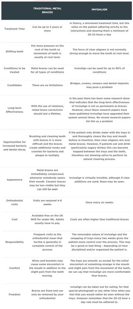 Are braces or Invisalign better? Unfortunately, this question is not easy to answer. Dentists have differing opinions about which is most effective. It depends on the type of condition that needs to be addressed, the severity of the condition, and the patient’s lifestyle and preferences. A recent article in the BMC Oral Health Journal by Yunyan Ke, Yanfei Zhu, and Min Zhu concluded: Clear aligners had the advantage of segmented tooth movement and reduced treatment time, but were not as effective as braces in establishing proper occlusal contact, controlling tooth torque and retention. Only an orthodontist can accurately assess the condition of your teeth and determine which orthodontics are appropriate and which treatments are best. However, the table below presents the most important facts about the strengths and weaknesses of braces compared to Invisalign.